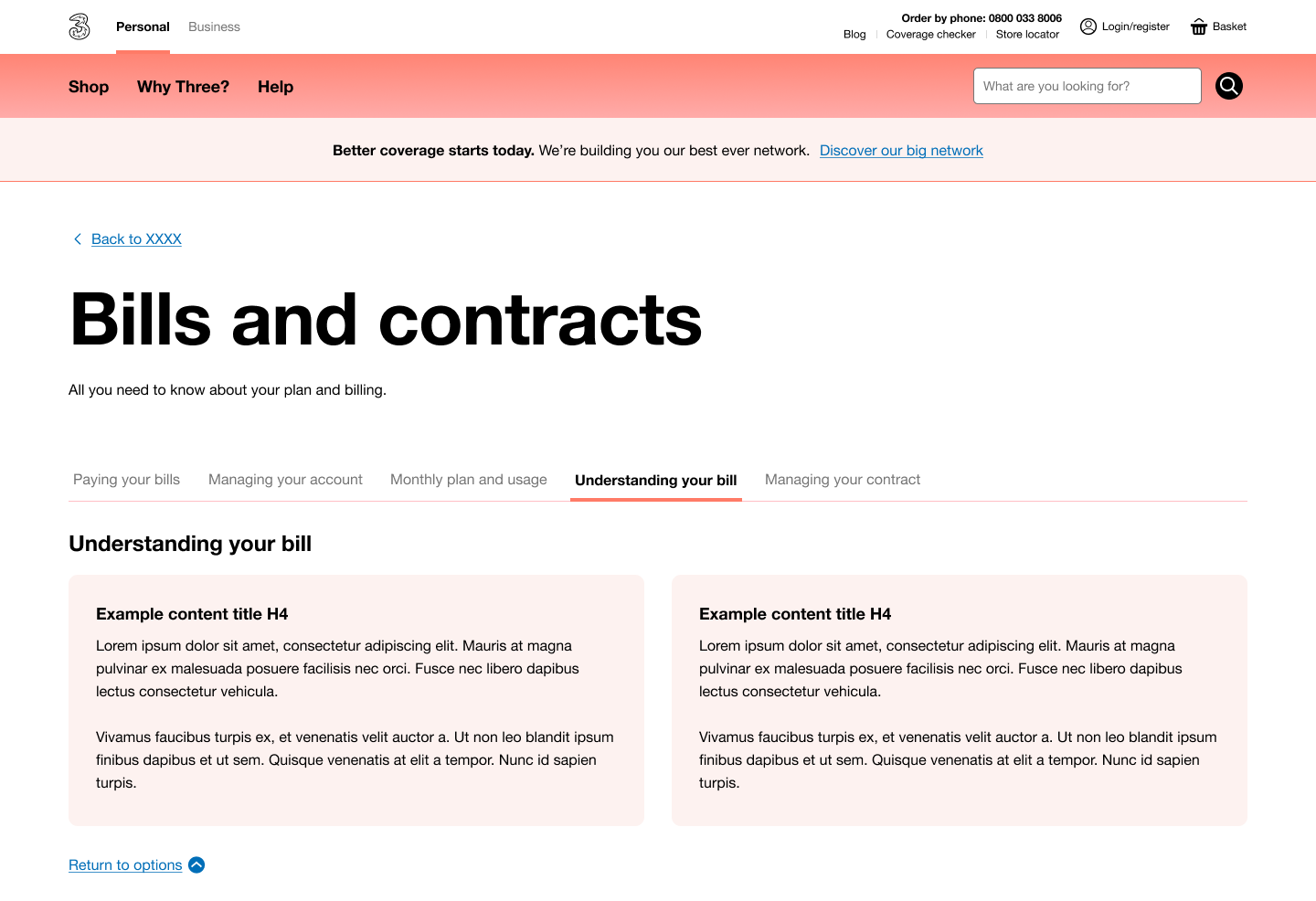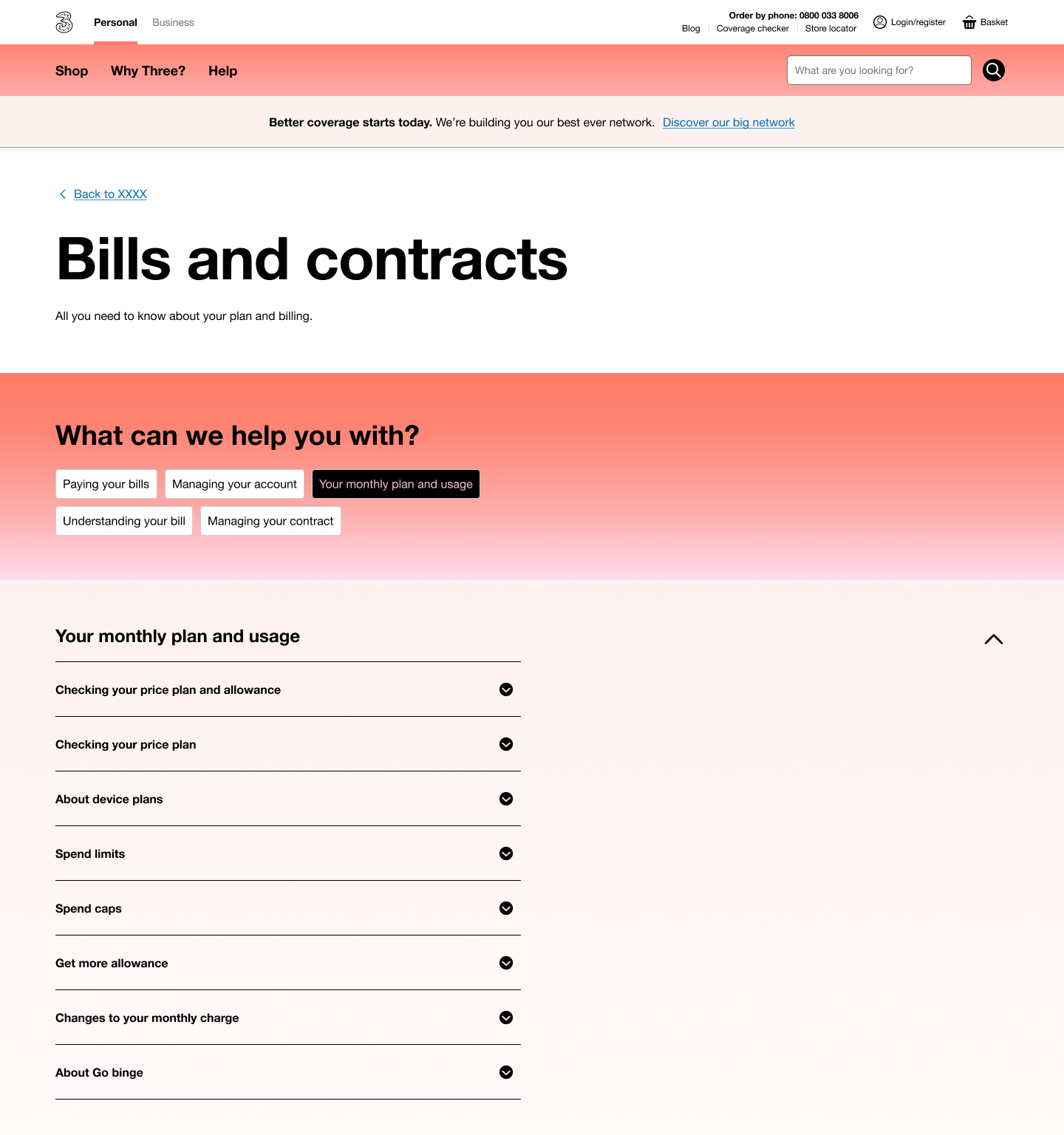 My last agile squad with Three was with the Customer Support team. Usually Support focuses on self support articles and links pegging to other relative pages. My job was to coordinate with the copy writer and organise content into a more UX visual appealing architectural design - which was one of my challenges. The other major challenge was to design on the guidelines of the company’s Digital Design System (DDS), which was used as a standard for site builders that operate on an AEM (Adobe Experience Manager) system. Anything beyond that system has to be hard coded then embeded within the DDS.