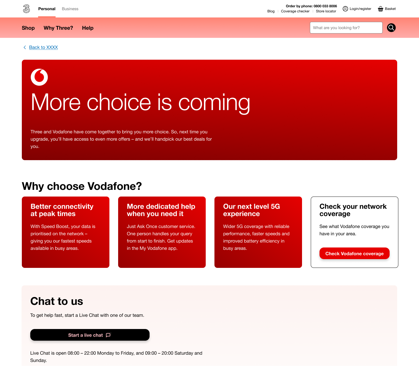 Business requirements were for not logging into My3, but to call the chat with customer support and they will do the network switch. The only CTA on the page was to link to the Vodafone network checker page. The UI was designed according to Vodafone’s colours and we used there brand design system assets - colour of the banner, tiles and the button.