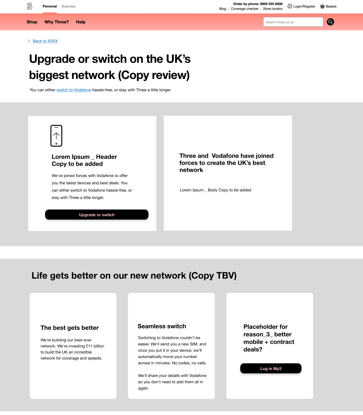 Second iteration was conducted in collaboration with the copy writer, whom received further content instructions from business. I also expanded the FAQ section and used Vodafone iconography for some visual presentation. Another major UI change was to Three’s assets for the first 2 sections of the page, as we thought this message is directed to Three’s customers then down the line, when scrolling down, we can highlight the benefits of joining Vodafone.