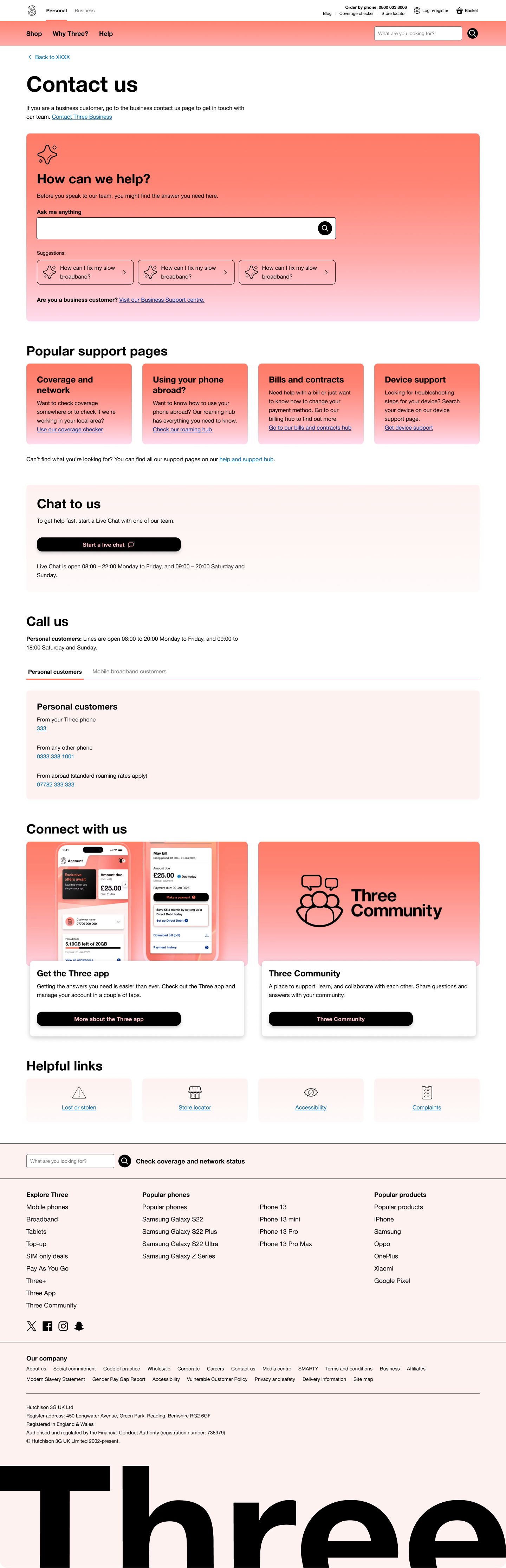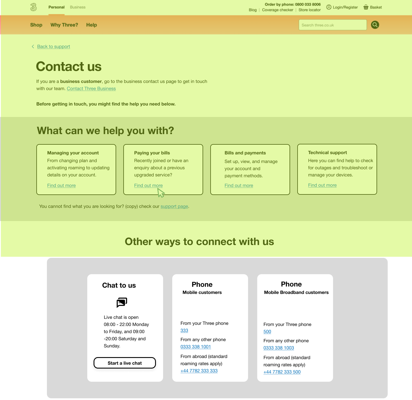One of the favourite high profile projects I worked on was the ‘Contact Us’ page. The UX challenge I faced was the dilemma whether the preference was to prioritise self support over ‘calling us’. From a business point of view, self service results in less contact with customer support, but from a customer point of view, they want to get to the point and call someone to discuss there problem. What we had before (as shown below) an out of brand design that (again) contains lots of content and needs a hierarchy review.